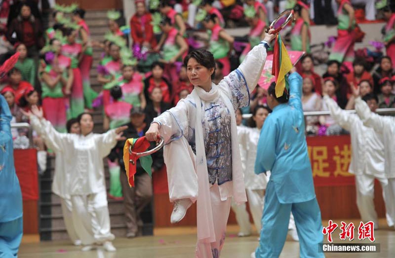 3月23日,重庆渝中区老年人体育协会的大妈们以中国功夫、健身秧歌、健身操舞等节目展现出积极向上的健康生活。据悉,重庆市渝中区属于人口老龄化地区,全区12个街道78个社区都建有老年体协,组织广大老年人锻炼身体,不断提高老年人的生活质量,实现“康、乐、寿”的梦想。陈超 摄