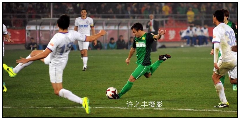 2014年3月24日晚,中超联赛第3轮最后一场在北京工人体育场进行,北京国安对阵上海绿地。比赛第40分钟,张呈栋为国安赢得点球,张稀哲操刀命中;第49分钟,乌塔卡入球被误判为越位取消;第53分钟,国安精妙团队配合由巴塔拉补射入球,最终国安2比0击败绿地,图为国安队的巴塔拉打入一球。