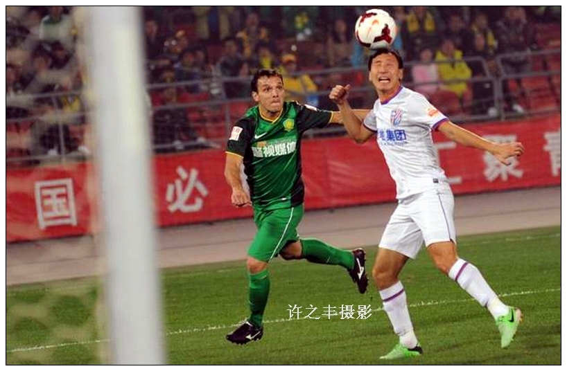 2014年3月24日晚,中超联赛第3轮最后一场在北京工人体育场进行,北京国安对阵上海绿地。比赛第40分钟,张呈栋为国安赢得点球,张稀哲操刀命中;第49分钟,乌塔卡入球被误判为越位取消;第53分钟,国安精妙团队配合由巴塔拉补射入球,最终国安2比0击败绿地,图为国安队的巴塔拉打入一球。