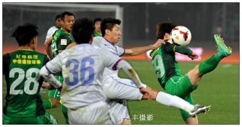 2014年3月24日晚,中超联赛第3轮最后一场在北京工人体育场进行,北京国安对阵上海绿地。比赛第40分钟,张呈栋为国安赢得点球,张稀哲操刀命中;第49分钟,乌塔卡入球被误判为越位取消;第53分钟,国安精妙团队配合由巴塔拉补射入球,最终国安2比0击败绿地,图为国安队的巴塔拉打入一球。