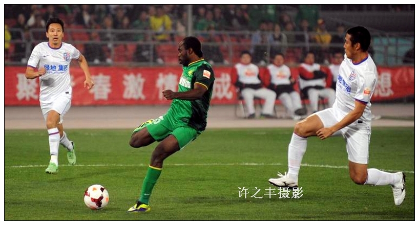 2014年3月24日晚,中超联赛第3轮最后一场在北京工人体育场进行,北京国安对阵上海绿地。比赛第40分钟,张呈栋为国安赢得点球,张稀哲操刀命中;第49分钟,乌塔卡入球被误判为越位取消;第53分钟,国安精妙团队配合由巴塔拉补射入球,最终国安2比0击败绿地,图为国安队的巴塔拉打入一球。