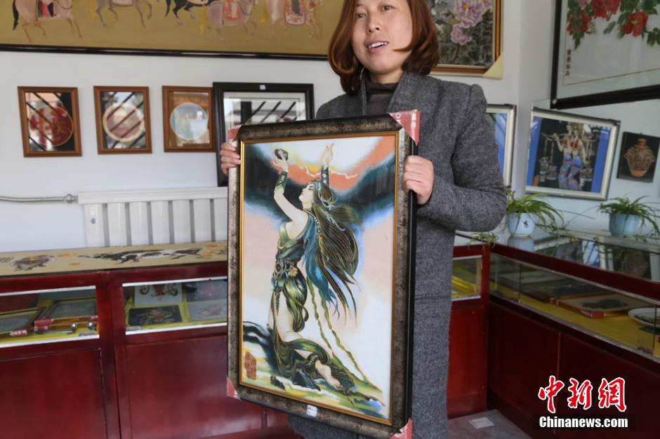 3月23日至24日,中新网记者在甘肃静宁县走基层采访发现,有一种名叫“掐丝”的画美如国画。掐丝画是一种纯手工工艺,利用氧化铝丝先在木板、塑板或金属板上制作出画的主轮廓,每一笔都由掐断的铝丝组成,所以称为掐丝。然后在这些轮廓内填上天然颜料(彩砂),粒粒彩砂晶莹剔透,闪闪发光,它既有工笔画的精巧细致,又有油画的实景质感,也有水彩画的空灵透明。张玉玺 摄