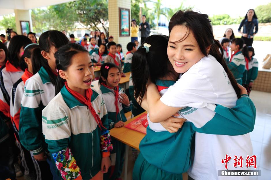 3月24日,台湾著名歌手、演员伊能静来到广州从化高平小学,向该校小学生捐赠“夏士莲·静新绿书包”,并亲自给小学生授课——爱是什么?“夏士莲·静新绿书包行动”将惠及广东、四川、广西、湖南、江苏、福建等六个省15000名小学生,书包内分别有《爱是什么》、《孔子的故事》、《安徒生童话》、《爱丽丝梦游仙境》等书籍,传递社会对儿童的关爱与祝福。中新社发 陈文 摄