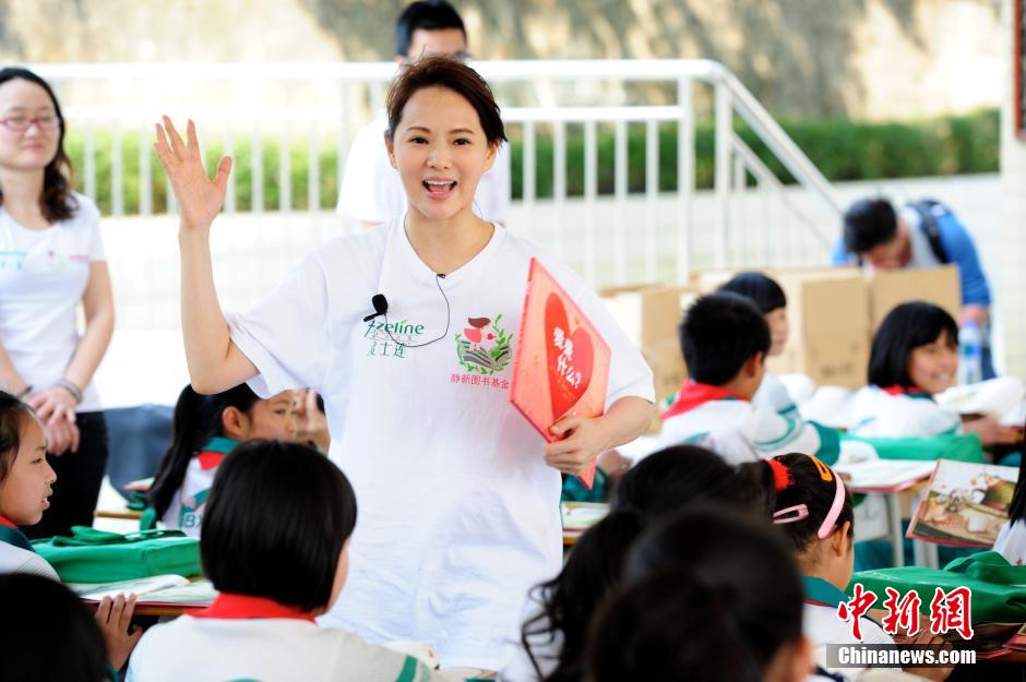 3月24日,台湾著名歌手、演员伊能静来到广州从化高平小学,向该校小学生捐赠“夏士莲·静新绿书包”,并亲自给小学生授课——爱是什么?“夏士莲·静新绿书包行动”将惠及广东、四川、广西、湖南、江苏、福建等六个省15000名小学生,书包内分别有《爱是什么》、《孔子的故事》、《安徒生童话》、《爱丽丝梦游仙境》等书籍,传递社会对儿童的关爱与祝福。中新社发 陈文 摄