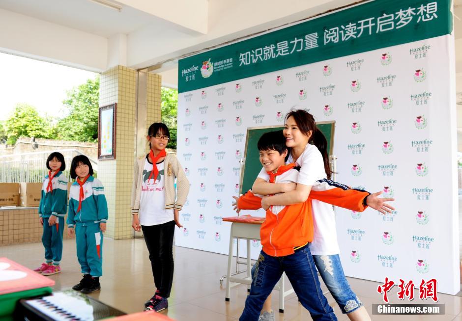 3月24日,台湾著名歌手、演员伊能静来到广州从化高平小学,向该校小学生捐赠“夏士莲·静新绿书包”,并亲自给小学生授课——爱是什么?“夏士莲·静新绿书包行动”将惠及广东、四川、广西、湖南、江苏、福建等六个省15000名小学生,书包内分别有《爱是什么》、《孔子的故事》、《安徒生童话》、《爱丽丝梦游仙境》等书籍,传递社会对儿童的关爱与祝福。中新社发 陈文 摄