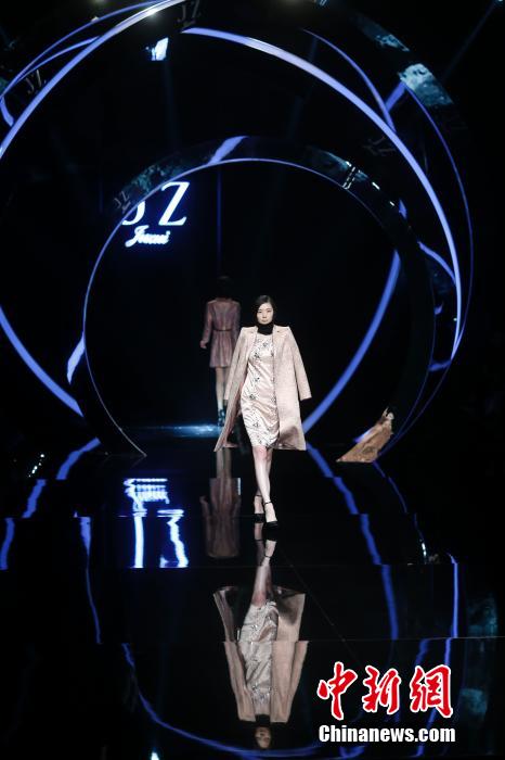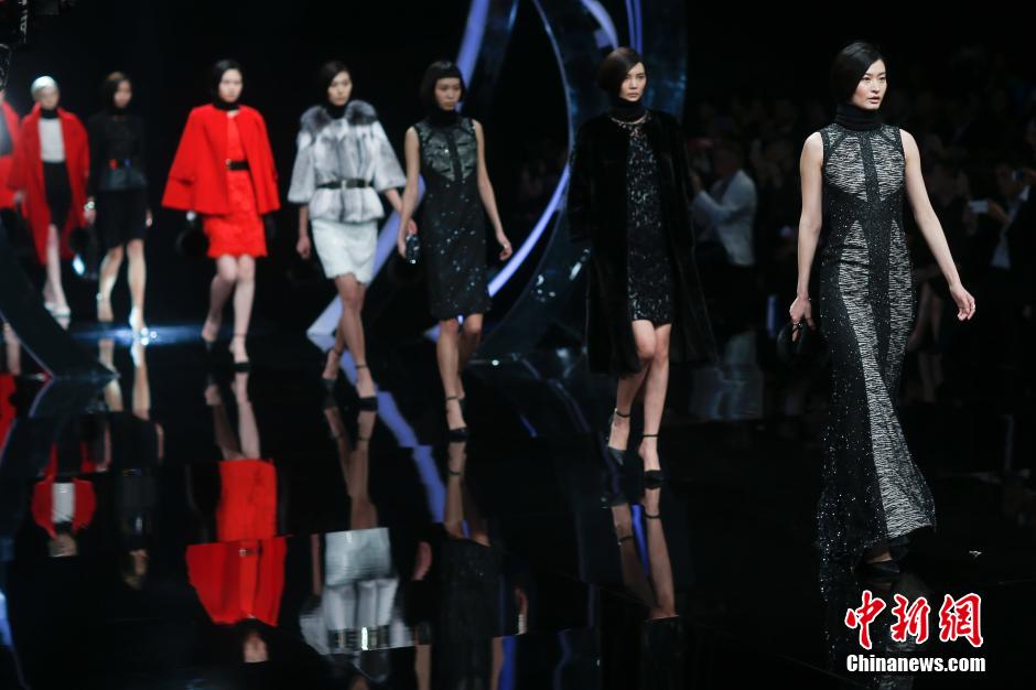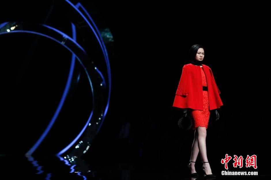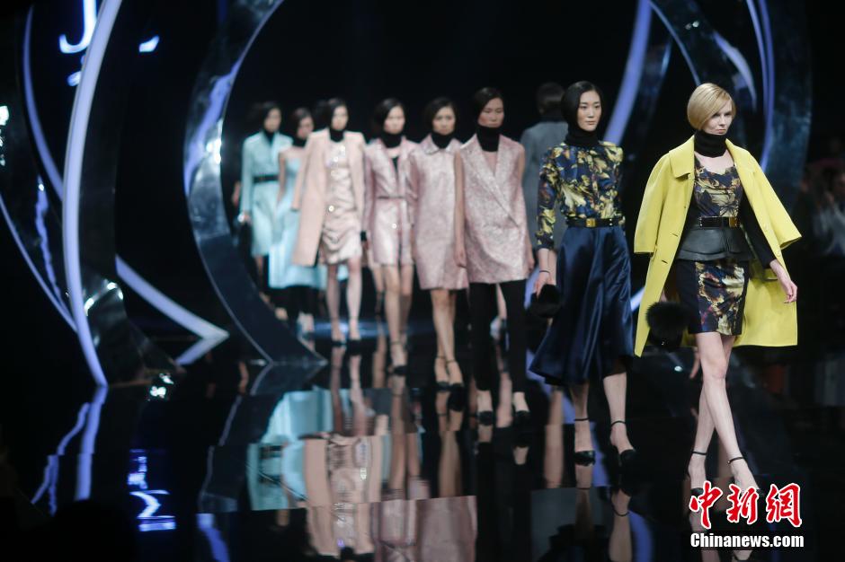 3月24日,中国国际时装周(2014/2015秋冬系列)在北京开幕,国内知名女装品牌“玖姿”的时装发布会作为时装周首秀在北京饭店举行。本季时装周共有国内外60家品牌和机构、47位中外设计师、近110位设计师及模特新秀参加。中新社发 盛佳鹏 摄