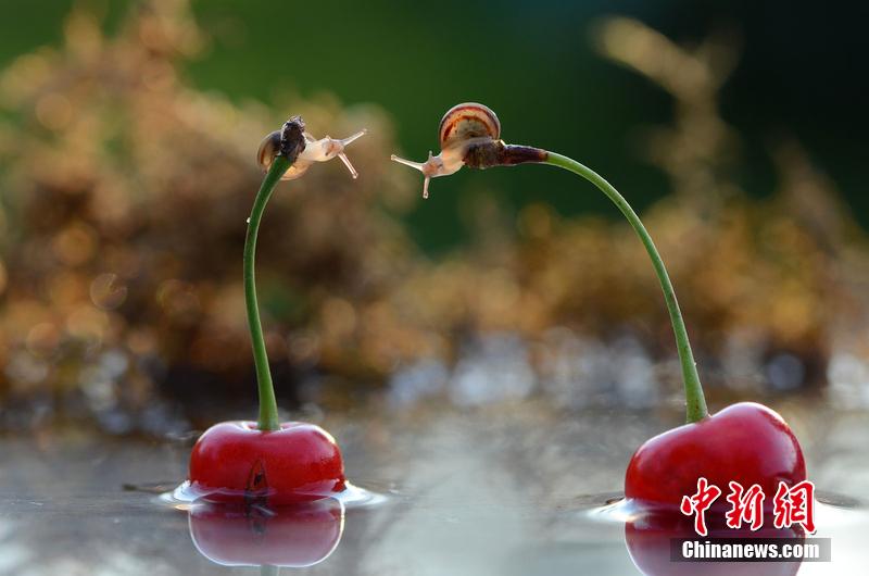 2014年3月25日报道,看来就算是再小的动物也会有浪漫的情感,你看,这两只小蜗牛颤颤悠悠的倚在两颗樱桃的梗上,伸长了脖子,用尽全力想要来一个甜蜜的吻。乌克兰别尔季切夫48岁的摄影师Vyacheslav Mischenko在林中散步时拍到了这温馨的一幕。