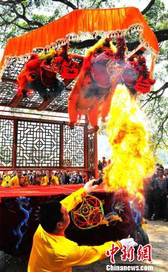 3月25日,中国福安·穆云畲乡第四届“桃花节”暨民俗文化活动展演在素有“世外桃源”之称的福建福安市穆云畲族乡虎头村开幕,吸引游人齐聚看桃花、游乡村、赏民俗。图为享有“中华一绝”美誉的霍童线狮表演。中新社发 吕巧琴 摄
