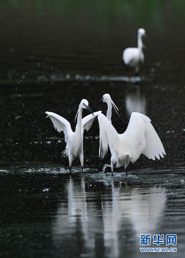 3月25日,在广西柳州市中心的雀山公园湿地,白鹭在水中觅食、嬉戏。近年来,广西柳州市环境质量不断改善,每年春、秋两季都有大量白鹭在迁徙过程中途径柳州市区,成了一道景观。 新华社发 (殷武 摄)