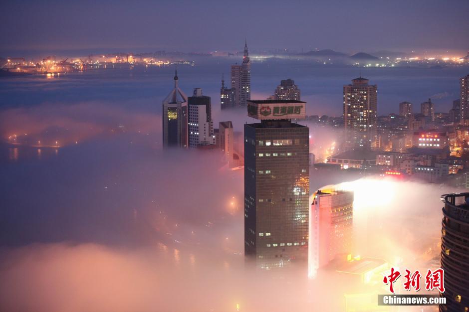 青岛现平流雾 夜景宛如仙境