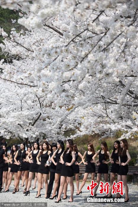 当地时间4月2日,韩国大田大学模特专业的学生在樱花树下上课。众美女穿黑色短裙在美景下秀美腿。