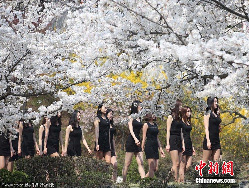 当地时间4月2日,韩国大田大学模特专业的学生在樱花树下上课。众美女穿黑色短裙在美景下秀美腿。
