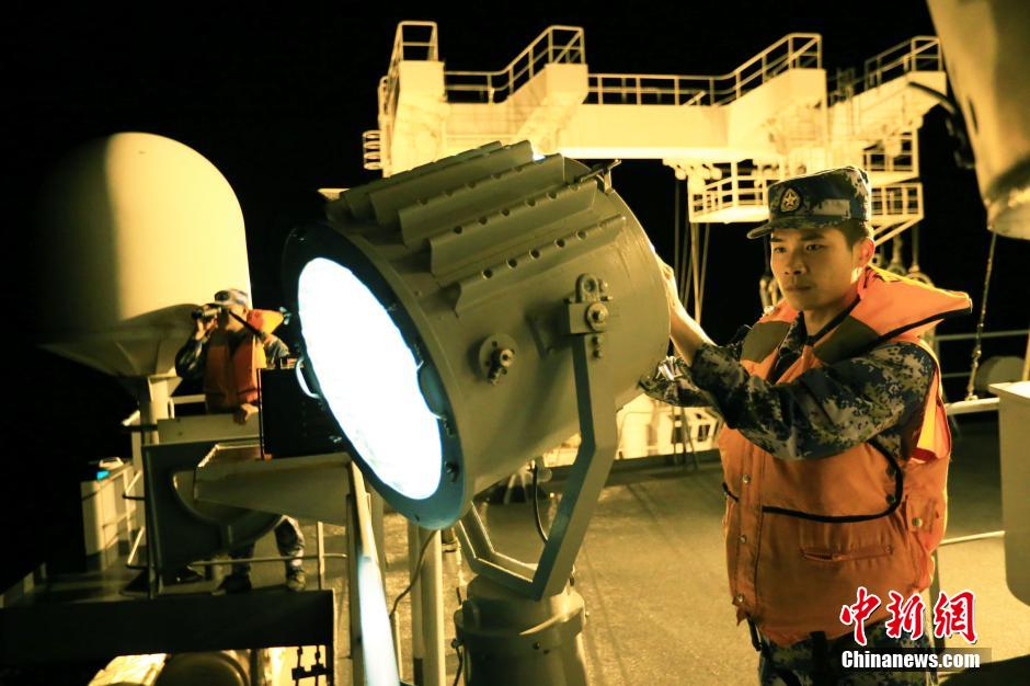 4月1日晚至2日中午,在澳大利亚珀斯以西海域约1000海里处执行搜寻任务的海军千岛湖舰根据海上编队指挥所指令,对通报的位于搜索海区东北边缘的漂浮物进行昼夜连续搜索,发现并成功打捞上多件漂浮物。图为观通部门战士开启探照灯,加强对海面进行观察。中新社发 代宗锋 摄