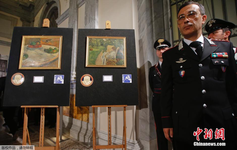 当地时间4月2日,意大利罗马,被重新发现的印象派保罗·高更画作《桌上的水果和小狗》和纳比派画家皮埃尔·博纳尔的《女人和两把沙发椅》。
