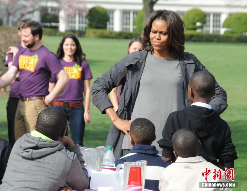 华盛顿时间4月2日,美国第一夫人米歇尔邀请20多名小学生来到白宫菜园,与她一道种菜。2009年与丈夫奥巴马入主白宫后,米歇尔在白宫南草坪辟出菜园,坚持年年种菜,并以白宫菜园为起点,在全美发起“大家动起来”(Let's Move)倡议,呼吁多吃蔬菜水果,配以体育锻炼来缓解美国人尤其是儿童的肥胖问题。 中新社发 德永健 摄