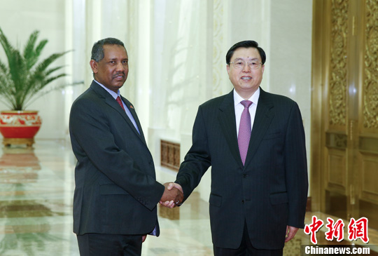 4月3日,中国全国人大常委会委员长张德江在北京人民大会堂与苏丹国民议会议长法提赫举行会谈。中新社发 杜洋 摄