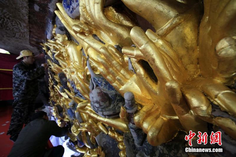 4月3日,重庆市大足区宝顶山千手观音抢救性修复工程现场,工作人员正在进行贴金修复。截至当天,已初步完成230只手的贴金修复,预计整个修复工程将于2015年上半年完成。罗国家 摄