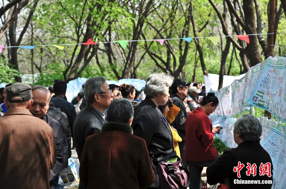 4月3日,一白发父亲登高张贴孩子征婚信息。当日,在济南“三月三”千佛山相亲会上,许多白发苍苍的父母亲临会场为自己的女儿选“乘龙快婿”,他们手持相机、本子记录中意男士的征婚信息。中新社发 张勇 摄