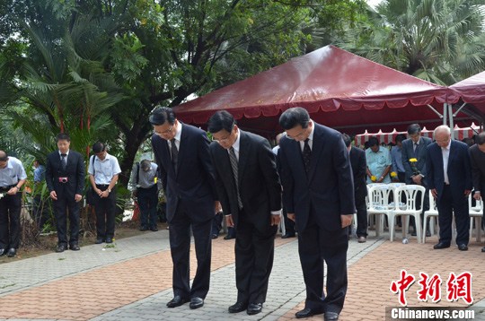 马来西亚华人公会总会长廖中莱(右)、马中华大会堂总会长方天兴(中)和中国驻马大使黄惠康等向二战牺牲先烈鞠躬致敬。中新社发 黄鸿斌 摄