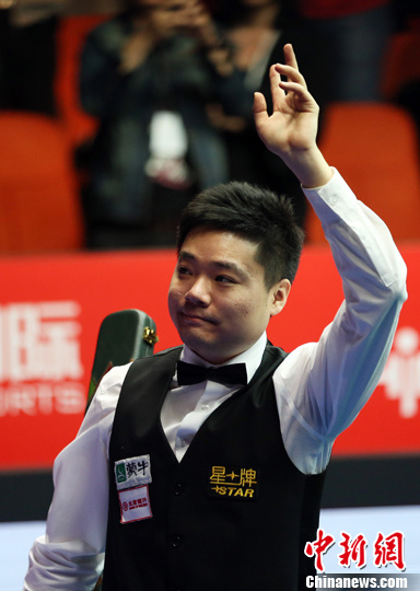 4月3日,丁俊晖赛后向球迷挥手致意。当日,在2014斯诺克中国公开赛第三轮比赛中,丁俊晖以5比2战胜希金斯,晋级八强。中新社发 韩海丹 摄