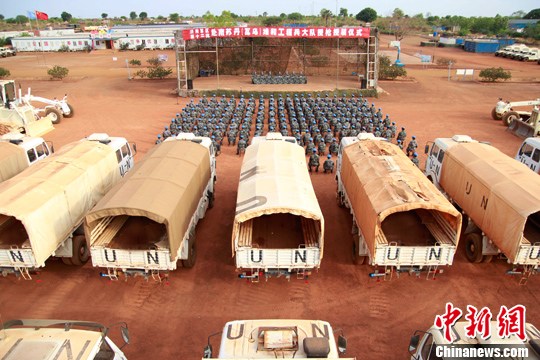 当地时间4月2日,中国第十二批赴南苏丹维和工程兵大队授枪授装仪式在瓦乌UN城举行。中新社发 郝国华 摄