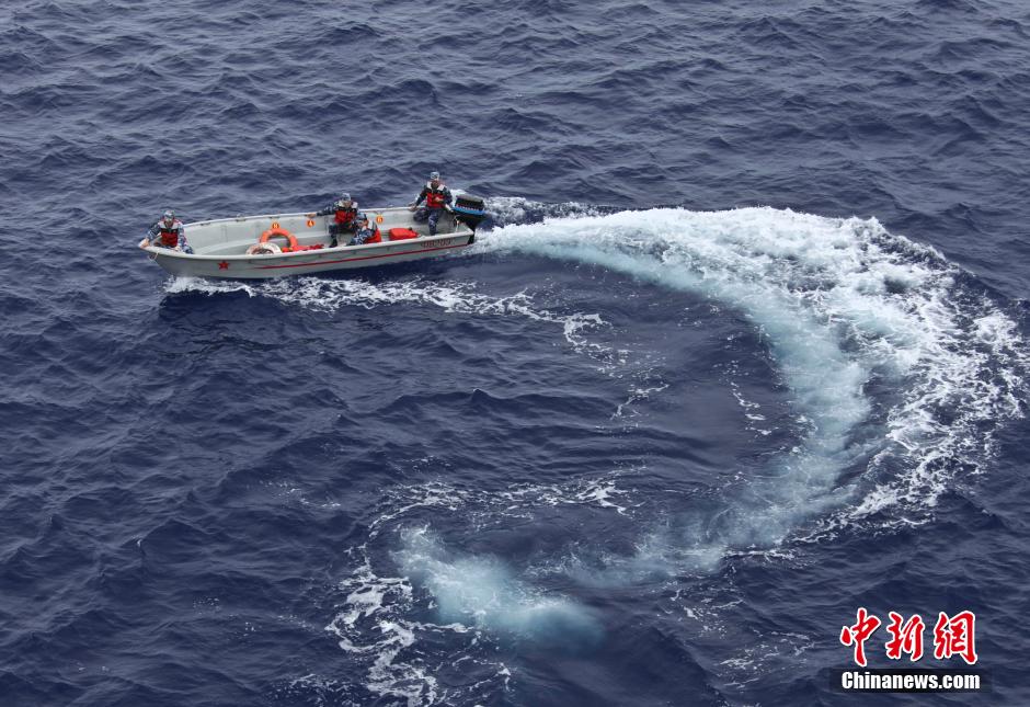 4月7日,根据澳方通报和统一安排,中国海军井冈山舰、昆仑山舰在南印度洋划设 的任务海区,与海巡01船、东海救101船联合展开搜寻马航失联客机任务。图为井冈山舰派出冲锋舟搜索。中新社发 尹海明 摄