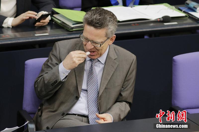 当地时间2014年4月9日,德国柏林,德国内政部长德梅齐埃在议会预算辩论上偷擦唇膏。