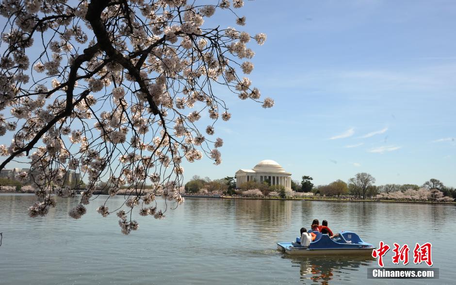 美国首都华盛顿的数千株樱花树正渐次绽放,迎来最佳观赏期,图为4月12日潮汐湖畔樱花绽放,人们流连其中欣赏美景。2014年华盛顿樱花节于当地时间3月20日至4月13日举行,华盛顿12日还举行了盛大的樱花节大游行,吸引数千民众驻足观看。中新社发 张蔚然 摄