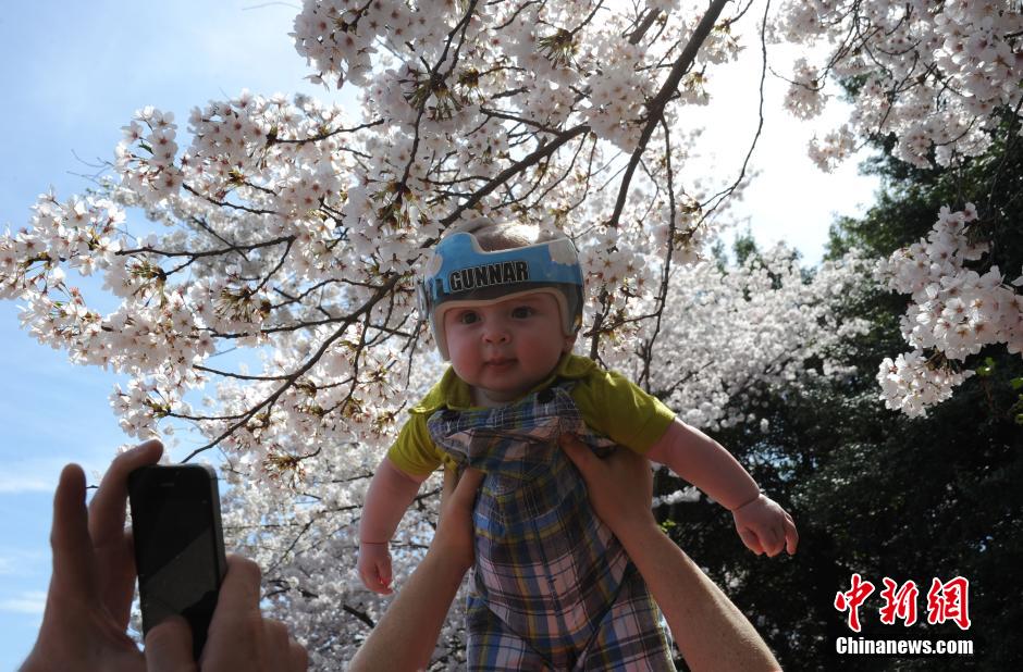 美国首都华盛顿的数千株樱花树正渐次绽放,迎来最佳观赏期,图为4月12日潮汐湖畔樱花绽放,人们流连其中欣赏美景。2014年华盛顿樱花节于当地时间3月20日至4月13日举行,华盛顿12日还举行了盛大的樱花节大游行,吸引数千民众驻足观看。中新社发 张蔚然 摄