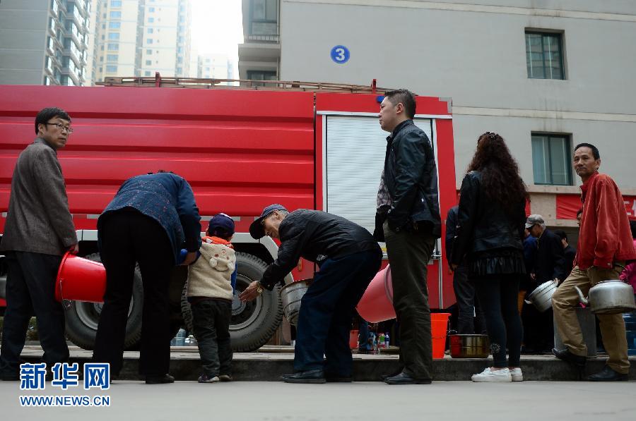 4月12日,在兰州市区一居民小区内,居民正在排队接水。 4月11日,兰州突发自来水苯超标事件。针对这一事件影响居民饮用水安全的问题,兰州市政府采取相应措施,保障瓶装水货源的供应;组织消防、环卫等相关部门,为居民定点、定时送水。新华社记者 张锰 摄