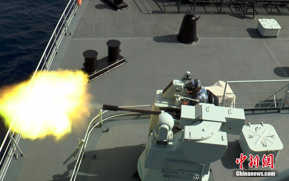 当地时间4月14日,中国海军第十六批护航编队太湖舰位亚丁湾西部海域,组织了火炮对模拟漂浮雷靶射击训练,有效检验了武器装备在舰艇连续航行条件下的状态性能,又带动了单舰整体训练水平的提高。图为火炮突出“火舌”,直击目标。中新社发 李秀林 摄