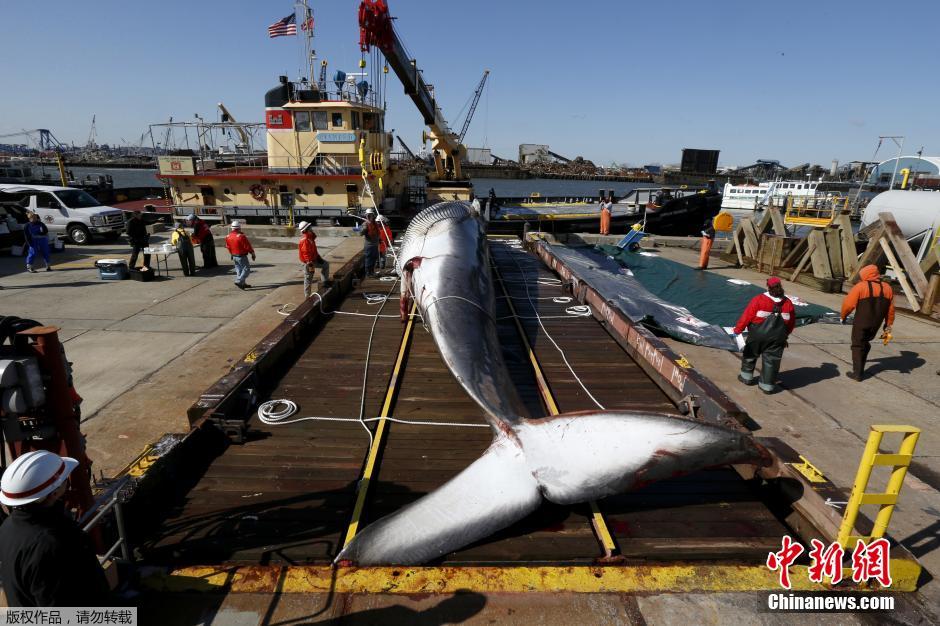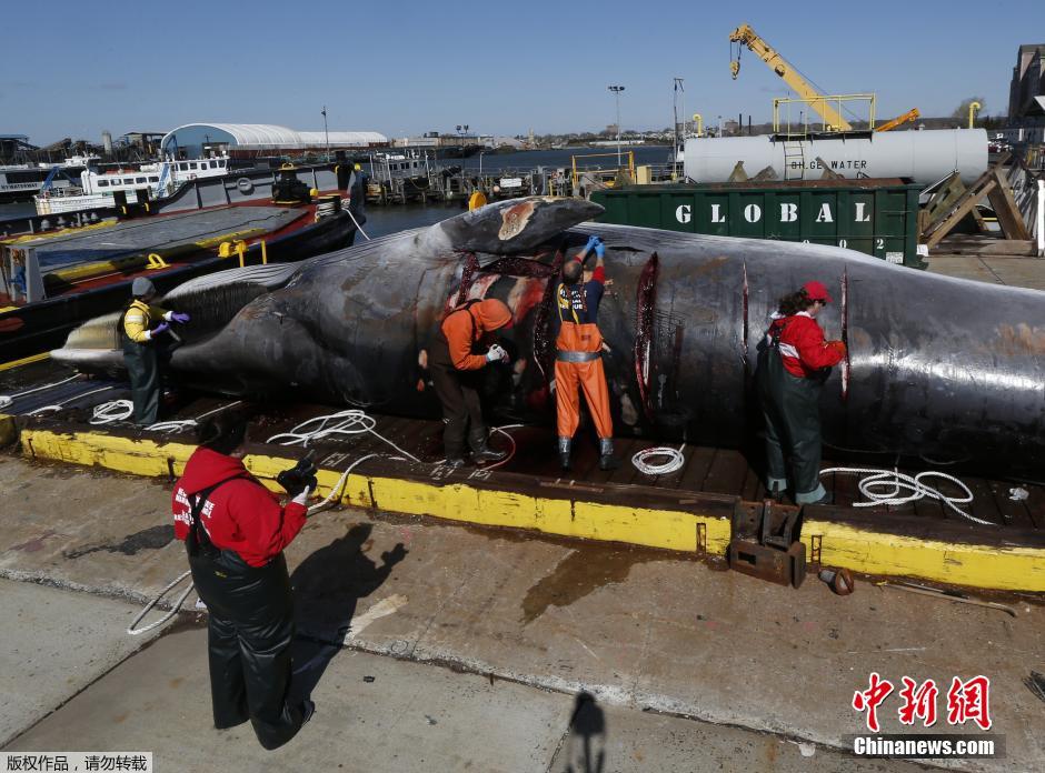 当地时间2014年4月16日,美国新泽西,一头超过16米的长须鲸尸体。这头因装上集装箱货运船而死亡的鲸鱼上周末在纽约港被发现,然后被拖至自由州立公园旁的美国陆军工程兵团驻地。该鱼类搁浅研究中心的一位发言人表示,鲸鱼在东海岸活动时撞上货轮的现象并非罕见。