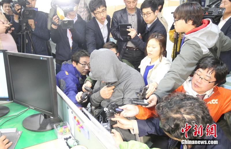 当地时间2014年4月17日,韩国木浦,沉没客轮“岁月号”的船长李俊硕在木浦警察署被传唤接受调查。图片来源:东方IC