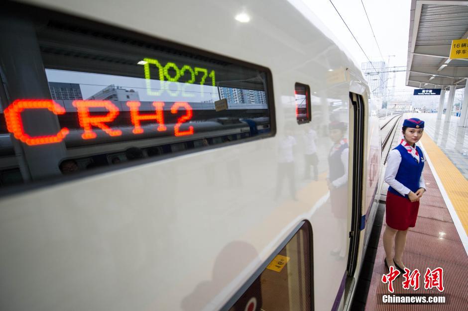 4月18日上午8时,南宁至广州铁路广西(南宁-梧州)段正式开通运营,将桂东南地区纳入高铁经济圈。据悉,2014年全国将开通逾7000公里新铁路,其中近九成集中在中西部地区,南广铁路是其中必保年底建成投产的重大项目之一。图为等待出发的列车。洪坚鹏 摄