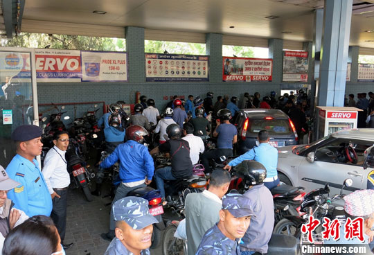 4月20日,加德满都一家加油站内挤满了排队的车辆。中新社发 符永康 摄
