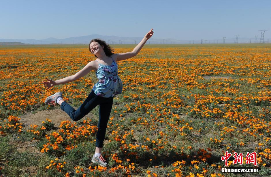 当地时间4月20日,加州羚羊谷罂粟保护区的罂粟花进入盛放期,自然绽放的罂粟花如同给大地披上一层金黄色的地毯。羚羊谷罂粟保护区位于兰卡斯特市以西15英里,是加州州立公园之一。保留区内主要以加州罂粟花为主,并有羽扇豆,直果草,小黄花及波斯菊等种类。由于冬季的几场充沛降雨,进入四月花季,大片的加州罂粟花海显得格外壮观。中新社发 毛建军 摄