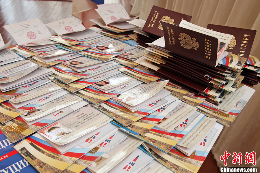 当地时间2014年4月22日,克里米亚辛菲罗波尔,当地一所中学的学生集体领取俄罗斯护照。