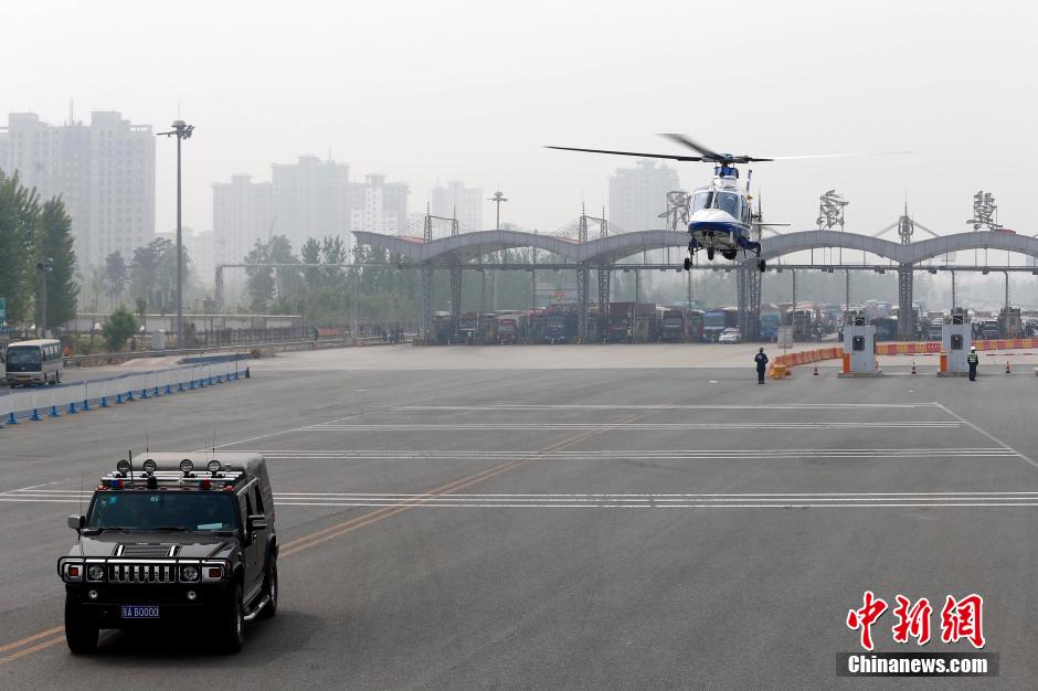 4月23日,京津冀三地警方签订了警务航空合作机制框架协议,并首次联合举行大型警航演练。根据协议,北京市公安局警航总队将协助津冀两地警方进行训练。津冀两地也将为北京警用直升机设置临时起降点。当日演习内容为“反劫持”,10点30分,天津的一名“恐怖分子”劫持了一辆白色轿车,打伤女司机后向北京驶来。警用直升机沿京开高速上空飞近,不停向地面通报大众轿车的情况,地面上,三辆警车埋伏在固安收费口,当“歹徒”闯关时,同时冲上,堵住轿车,抓住“罪犯”,直升机将受伤的女司机载走救治。中新社发 富田 摄