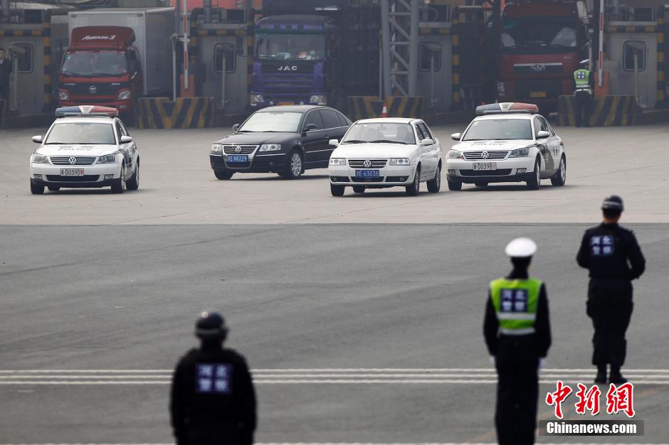 4月23日,京津冀三地警方签订了警务航空合作机制框架协议,并首次联合举行大型警航演练。根据协议,北京市公安局警航总队将协助津冀两地警方进行训练。津冀两地也将为北京警用直升机设置临时起降点。当日演习内容为“反劫持”,10点30分,天津的一名“恐怖分子”劫持了一辆白色轿车,打伤女司机后向北京驶来。警用直升机沿京开高速上空飞近,不停向地面通报大众轿车的情况,地面上,三辆警车埋伏在固安收费口,当“歹徒”闯关时,同时冲上,堵住轿车,抓住“罪犯”,直升机将受伤的女司机载走救治。中新社发 富田 摄