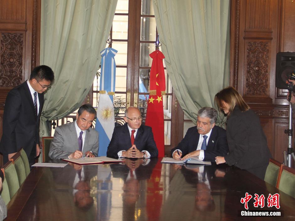 当地时间4月23日,中国外交部长王毅访问阿根廷。图为王毅与阿根廷计划、公共工程部部长德维多签署协议。中新社发 裘征宇 摄