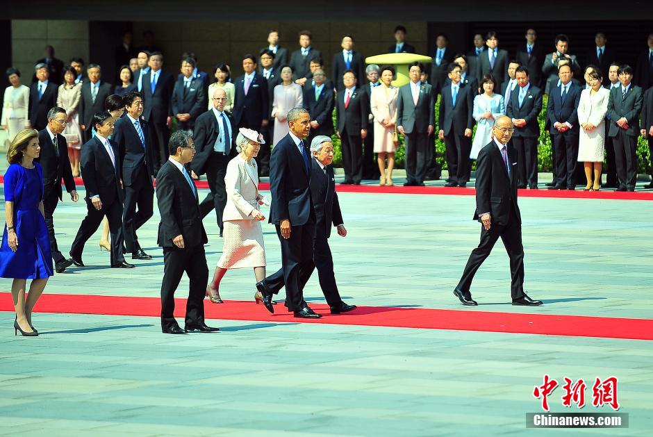 4月24日上午,日本皇宫内为奥巴马来访举行欢迎仪式,奥巴马检阅仪仗队。 以“国宾”身份23日晚间抵达东京的美国总统奥巴马,24日开始其正式访日日程。中新社发 王健 摄