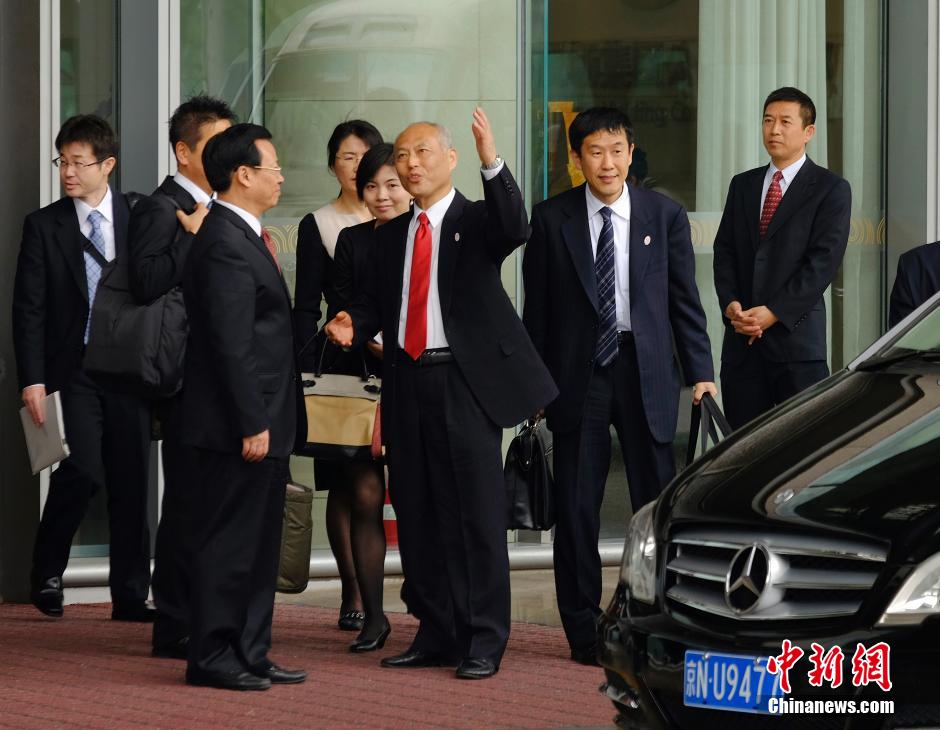 4月24日,日本东京都知事舛添要一(前右,红领带者)乘飞机抵达,开始对北京的访问。应北京市政府邀请,舛添要一于4月24日至26日访问北京。这是日本东京都知事时隔18年访问北京。北京与东京是友好城市。中新社发 侯宇 摄