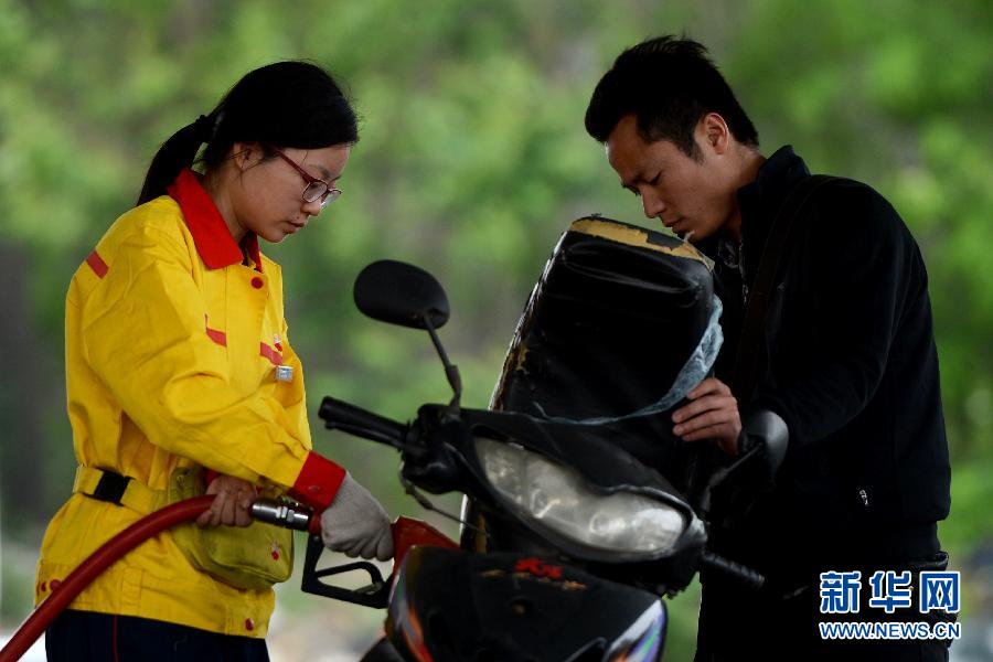 4月24日,安徽合肥一家加油站的工作人员在为机动车加油。当日,国家发展和改革委员会宣布,国内汽、柴油价格自25日起每吨分别上涨155元和145元,测算到零售价格90号汽油和0号柴油(全国平均)每升分别上调0.11元和0.12元。这是今年国内成品油价格第二次上调。新华社记者 张端 摄