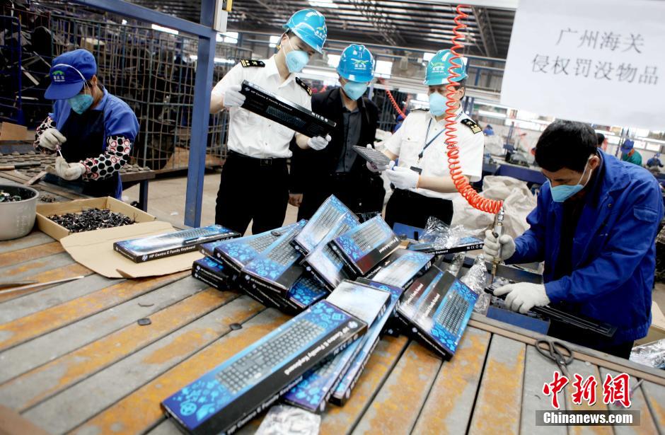 4月24日,“4.26”世界知识产权日前夕,广州海关以无害化方式公开销毁罚没的侵权电子产品3.6万余件,涉及“HP及图形”、“UL”、“SONY”等商标。图为广州海关无害化销毁侵权电子产品。中新社发 朱祉霖 摄