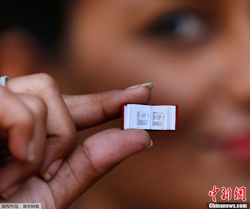 4月24日,斯里兰卡科伦坡,一名女子展示由斯里兰卡著名厨师Publis Silva推出的微型食谱书,该书的长宽仅有1厘米,重量仅为5毫克,书内包含了40份食谱。