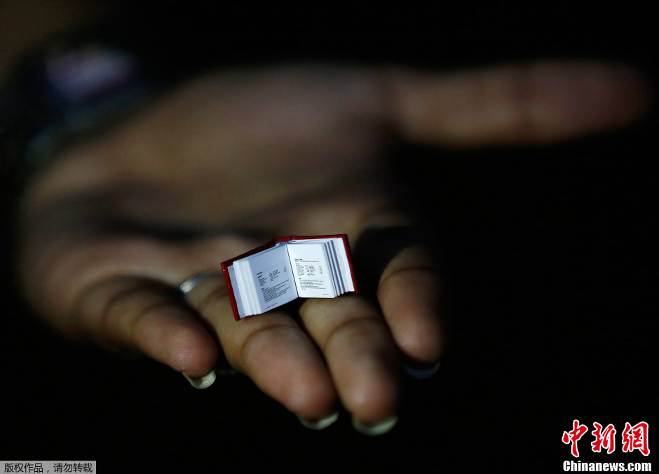 4月24日,斯里兰卡科伦坡,一名女子展示由斯里兰卡著名厨师Publis Silva推出的微型食谱书,该书的长宽仅有1厘米,重量仅为5毫克,书内包含了40份食谱。