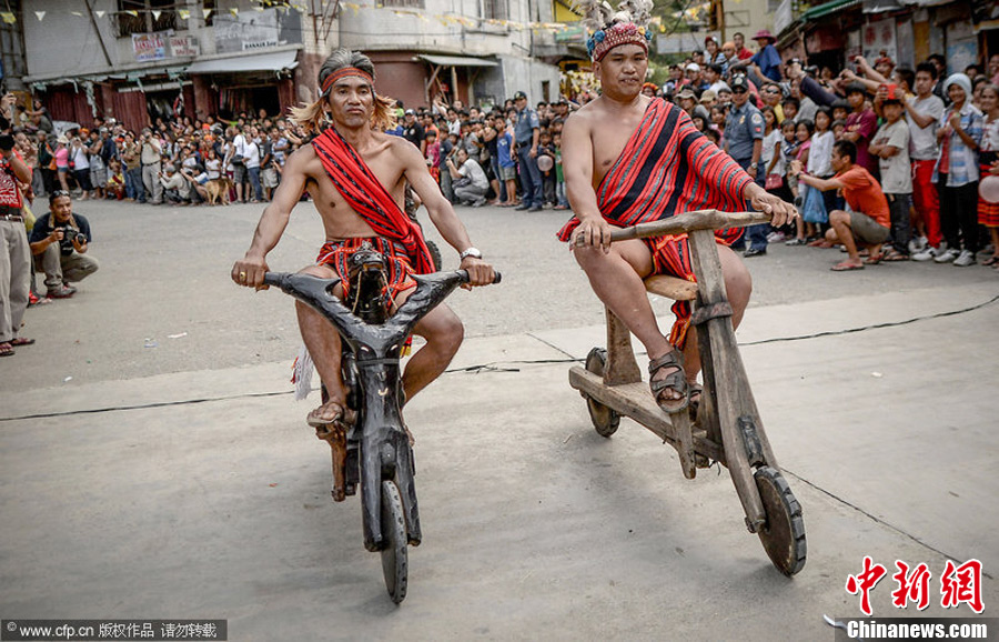 4月27日,菲律宾巴纳韦市,传统木制小摩托比赛举行。菲律宾巴纳韦市以巴纳韦高山梯田而闻名中外(号称世界第八大奇景),但是鲜有人知道巴纳韦也是菲律宾一项传统比赛的举办城市。这项比赛就是不怕死的人在没有任何保护的情况下骑着木制小摩托以时速50公里的速度下坡。