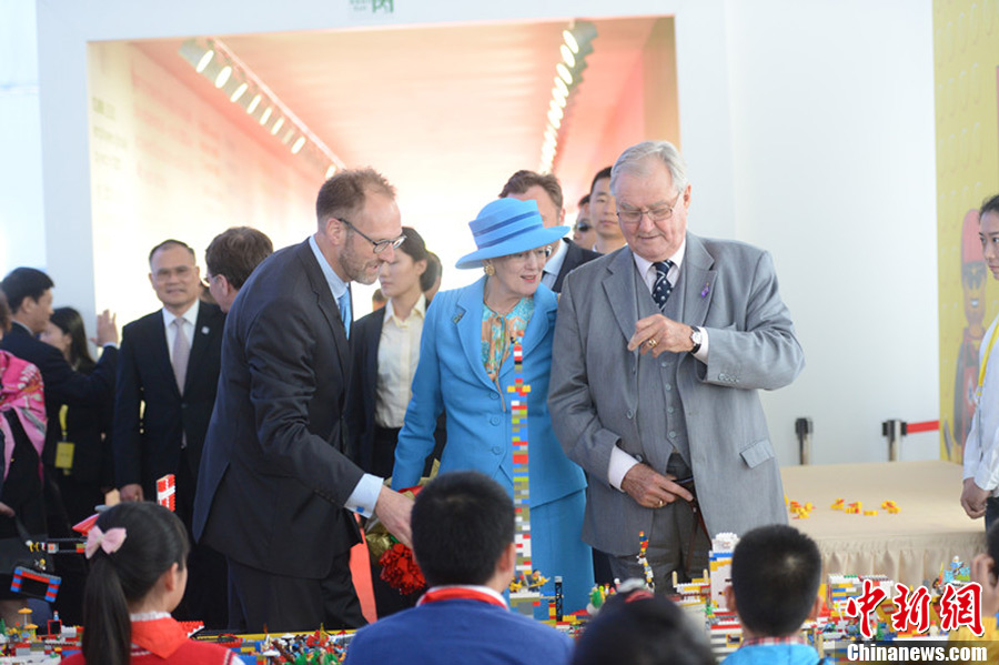 4月27日,丹麦女王玛格丽特二世和王夫亨里克亲王在浙江嘉兴市出席了丹麦知名玩具公司乐高集团在亚洲首个工厂的开工奠基仪式。图为乐高集团总裁兼首席执行官J?rgen Vig Knudstorp与丹麦女王玛格丽特二世陛下以及亲王亨里克殿下一起欣赏嘉兴当地孩子创意拼搭作品。中新社发 施佳秀 摄