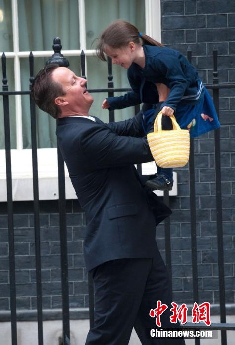 当地时间2014年4月29日,英国伦敦,英国首相卡梅伦抱着女儿弗洛伦斯离开唐宁街10号,他将提着草编包的女儿高高举起。