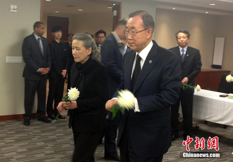 当地时间2014年4月29日,美国纽约,潘基文携妻子前往韩国驻纽约总领事馆设置的灵堂,吊唁韩国沉船事故死难者。